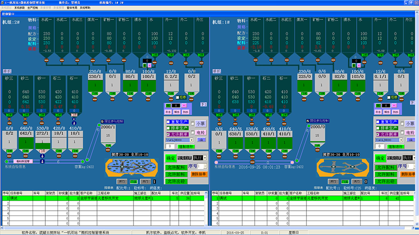 ●兩臺(tái)完全獨(dú)立的攪拌站(樓)由一套系統(tǒng)一臺(tái)電腦控制,一人操作,提高效率,節(jié)省人力資源,兩臺(tái)攪拌站(樓)同時(shí)生產(chǎn),互不干涉,且同時(shí)生產(chǎn)同一任務(wù)時(shí)不需要ERP參與即可實(shí)現(xiàn)車次和方量的累計(jì),該系統(tǒng)再進(jìn)一步降低用戶的生產(chǎn)運(yùn)營(yíng)成本。